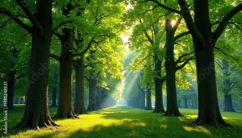 © Chanchai, Naklejka premium Mature beech trees in dense stand, sunlight filtering through, canopy, leaves, environment