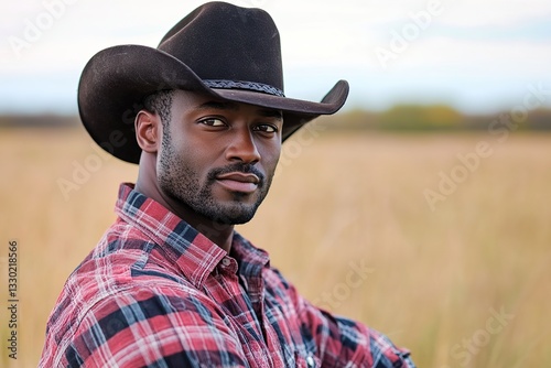 © Alina, Fototapeta premium Mature black american cowboy poses confidently in the open field during golden hour light