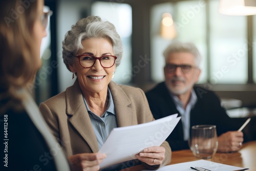 © yj, Fototapeta premium Mature business woman manager consulting older man client holding legal documents at meeting. generative AI