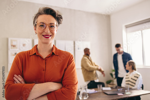 © Jacob Lund, Fototapeta premium Mature businesswoman smiling at the camera while standing in an office