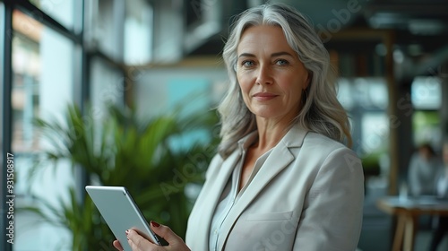© Generative AI, Fototapeta premium Mature busy happy businesswoman bank manager older female corporate executive holding digital tablet standing at work Middle aged professional business woman using tab computer in offi : Generative AI