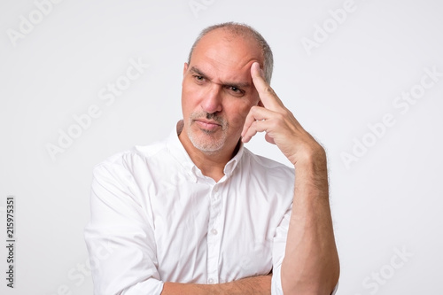 © Viktor Koldunov, Fototapeta premium mature caucasian man thinking pensive looking up studio portrait. He is trying to make a decision or right choose