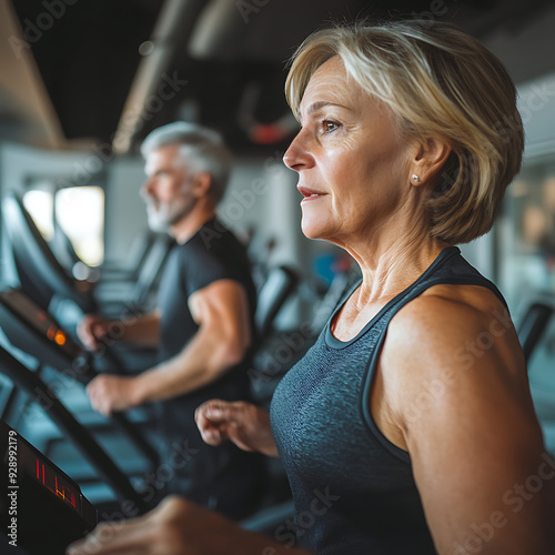 Obraz premium "Mature Couple Exercising on Treadmills: Active and Healthy Lifestyle"