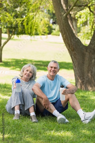 © WavebreakMediaMicro, Fototapeta premium Mature couple sitting with water bottles at park