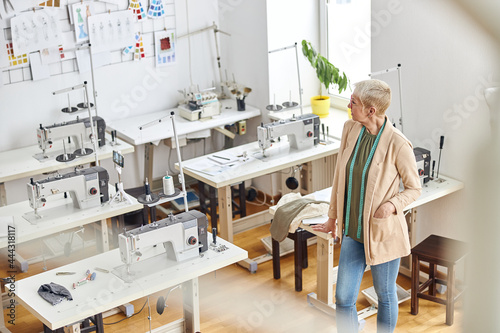 Fototapeta premium Mature dressmaker with stylish short haircut in empty sewing workshop