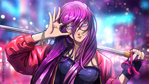 © warmtail, Fototapeta premium Mature elegant woman with purple hair drawn in anime style, she is a fighter with a katana in her hand playfully adjusts round glasses, she is wearing a red leather jacket and a black corset. 2d art
