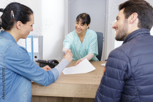 © auremar, Obraz premium mature female doctor consulting young couple in clinic