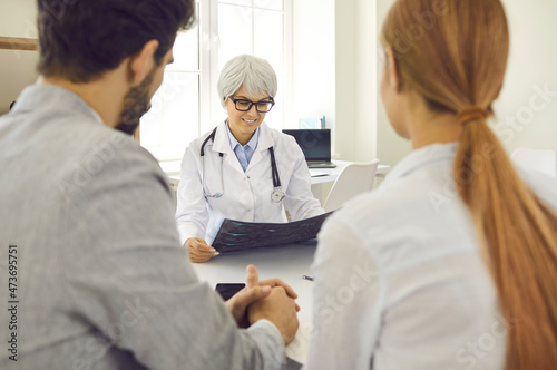 Obraz premium Mature female doctor in hospital advises expectant parents on planning pregnancy. Smiling health worker examines X-ray of married couple sitting with their backs to camera. Selective focus.