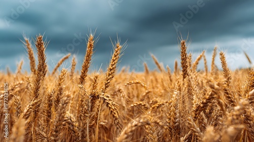 Fototapeta premium Mature golden grain stalks stand ready for harvest beneath a dramatically clouded sky