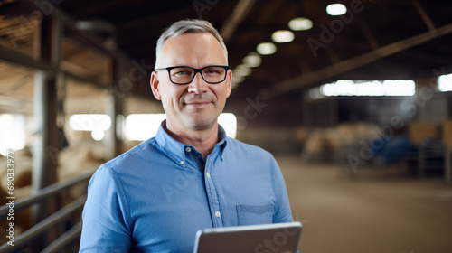 © Studio Nova, Fototapeta premium Mature man focusing on a tablet inside a barn with cows in the background, depicting modern farming management.