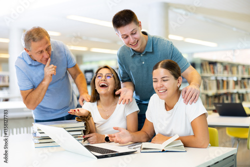 © JackF, Fototapeta premium Mature man placing fingers on lips with shh near a table with laughing women using computer in the library