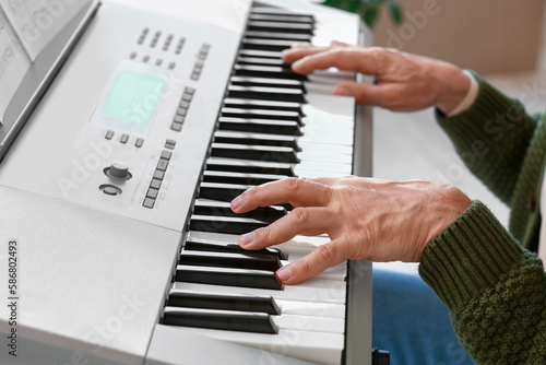 Fototapeta premium Mature man playing synthesizer at home, closeup