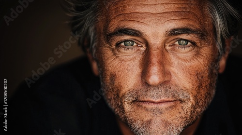 Obraz premium Mature man portrait, intense gaze, dark background, pensive expression; ideal...