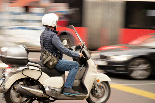 © Aleksandra, Fototapeta premium Mature man riding beige scooter on busy city street