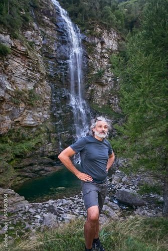 © marcovarro, Naklejka premium Mature man Waterfall, Sonogno, Switzerland