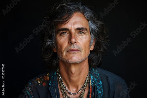 © ChaoticMind, Fototapeta premium Mature man with long hair and jewelry, showcasing a thoughtful expression against a dark backdrop