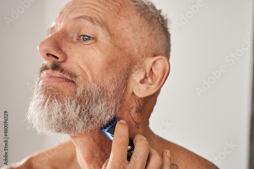 Obraz premium Mature man with naked torso shaving beard with electric razor