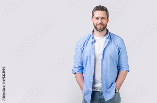 © be free, Fototapeta premium mature man with stubble isolated on grey background with copy space. mature man