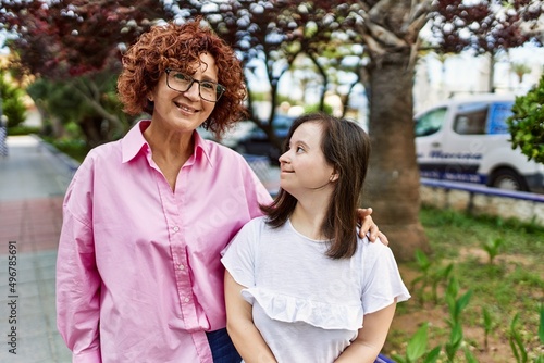 Fototapeta premium Mature mother and down syndorme daughter smiling happy and friendly outdoors