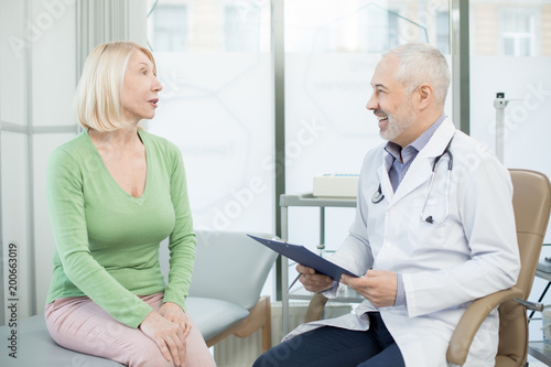 © pressmaster, Fototapeta premium Mature patient in green pullover talking to her therapeutist during appointment in clinics