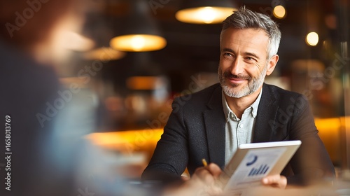 © Felippe Lopes, Fototapeta premium Mature professional smiles while working on a tablet reviewing charts in a cafe Relaxed and engaged in the digital presentation