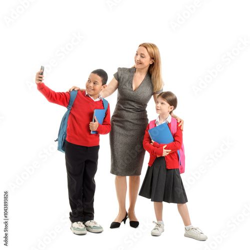 Obraz premium Mature teacher with little pupils taking selfie on white background