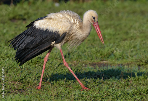 Obraz premium Mature White stork (Ciconia ciconia) walks on mowing grass field at spring