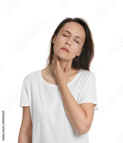 Fototapeta premium Mature woman doing thyroid self examination on white background