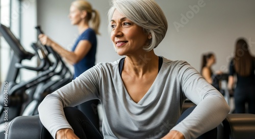 Obraz premium Mature woman in activewear taking a break at the gym. Healthy older adult...