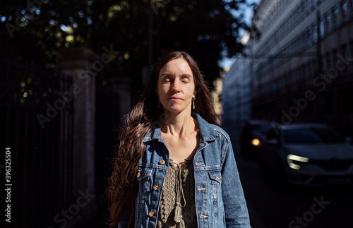 Fototapeta premium Mature woman standing outdoors in city or town park at dusk.