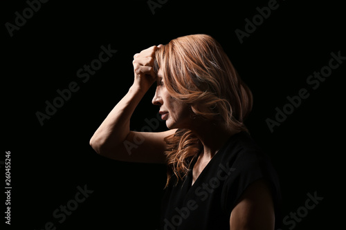 © Pixel-Shot, Obraz premium Mature woman suffering from headache on dark background