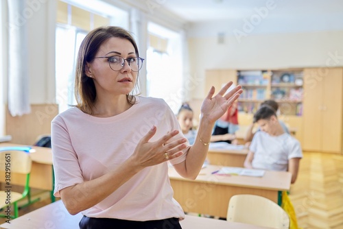 © Valerii Honcharuk, Fototapeta premium Mature woman teacher talking makes presentation teaches looking at camera