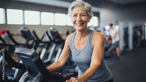 Fototapeta premium Mature woman using a stationary bike in a well-equipped fitness center,