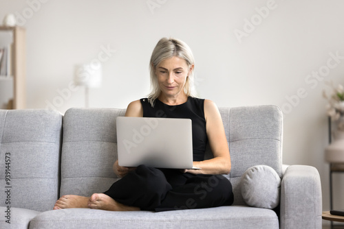Fototapeta premium Mature woman working on laptop at home, sit on sofa with wireless computer,...