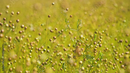 Naklejka premium Maturing flax in a large field, almost ready to harvest. Flax field in...