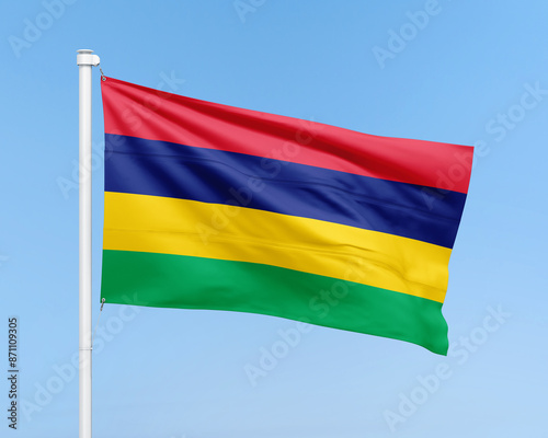 Obraz premium Mauritius flag on stick on sky background. Realistic flag illustration