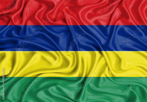 Naklejka premium Mauritius , national flag on fabric texture waving background.