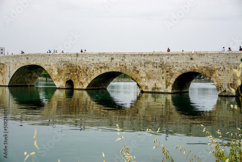 © Mehmet Doruk Tasci, Fototapeta premium 14 May 2022 Adana Turkey. Rock bridge on Seyhan River at Adana Turkey on a cloudy day