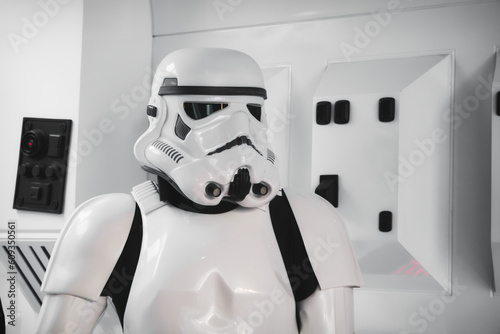 © TenWit, Naklejka premium 20 May 2023, St. Julians - Malta: A stormtrooper from the Star Wars movie in full body armor suit costume standing in a spaceship background setting