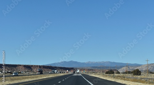 © JudithAnne, Fototapeta premium McCartys, New Mexico, USA - November 21, 2021: Mountains in the Distance as a Desert Highway Passes Through a Red Rock Valley on a Clear Fall Day