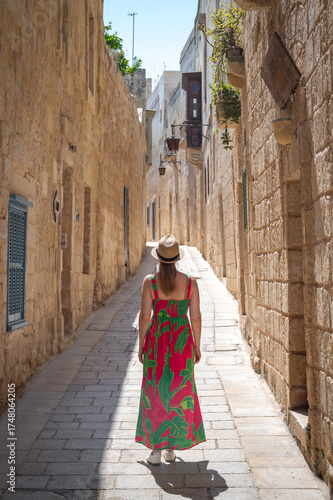 Naklejka premium Mdina, City of Silence, Malta. Woman in a colorful dress with her back turned.
