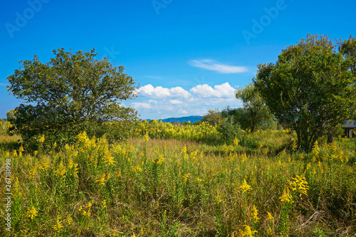 Fototapeta premium Meadow and mountain under blue sky