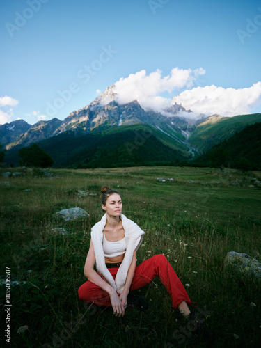 © SHOTPRIME STUDIO, Obraz premium Meadow and mountains backdrop with expansive nature and clear sky, featuring a relaxed woman in casual wear sitting on grass, capturing a scenic outdoor moment of calm and style