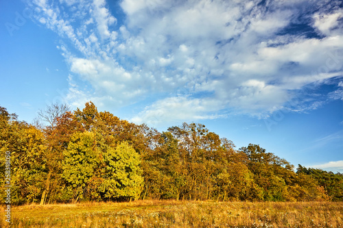 Fototapeta premium Meadow and trees with colorful leaves during autumn in Poland.