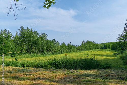 © SHOTPRIME STUDIO, Fototapeta premium Meadow field trees grass sky landscape in a sunny rural scene with rolling green pasture, wildflowers and edge of forest under blue summer sky for nature and outdoor use