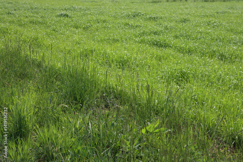 © saratm, Obraz premium Meadow for forage near wheat green field. Italian countryside on springtime. Agricultural backgrounds