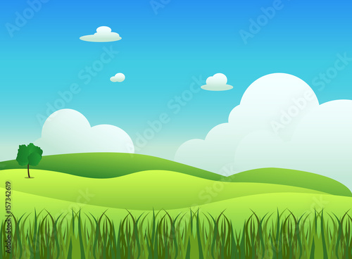 © vvadyab, Obraz premium Meadow landscape with grass foreground, vector illustration.Green field and sky blue with white cloud background
