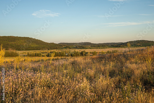 © Munka, Obraz premium Meadow of purple flowers on Tihany Peninsula in the evening sun.