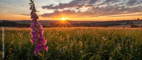 Fototapeta premium Meadow scene in Poland featuring a Purple foxglove at sunset