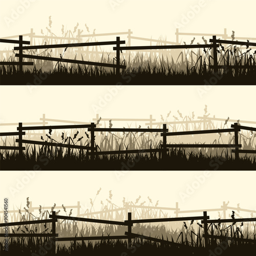Obraz premium Meadow silhouettes with grass and old wooden fence. Countryside, panoramic summer lawn rural landscape with herbs, weeds. Herbal border, frame element. Brown horizontal banners. Vector illustration